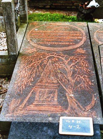 Het grafschrift wordt omhuld door een in zijn staart bijtende slang, de Ouroboros. Daaronder is een treurwilg met zeis afgebeeld, naast een sarkofaag en een omgekeerde fakkel. Boven de treurwilg vliegt links en rechts een vlinder.