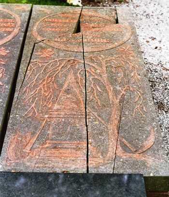 Het grafschrift wordt omhuld door een in zijn staart bijtende slang, de Ouroboros. Daaronder is een treurwilg met zeis afgebeeld, naast een sarkofaag en een omgekeerde fakkel. Boven de treurwilg vliegt links en rechts een vlinder.